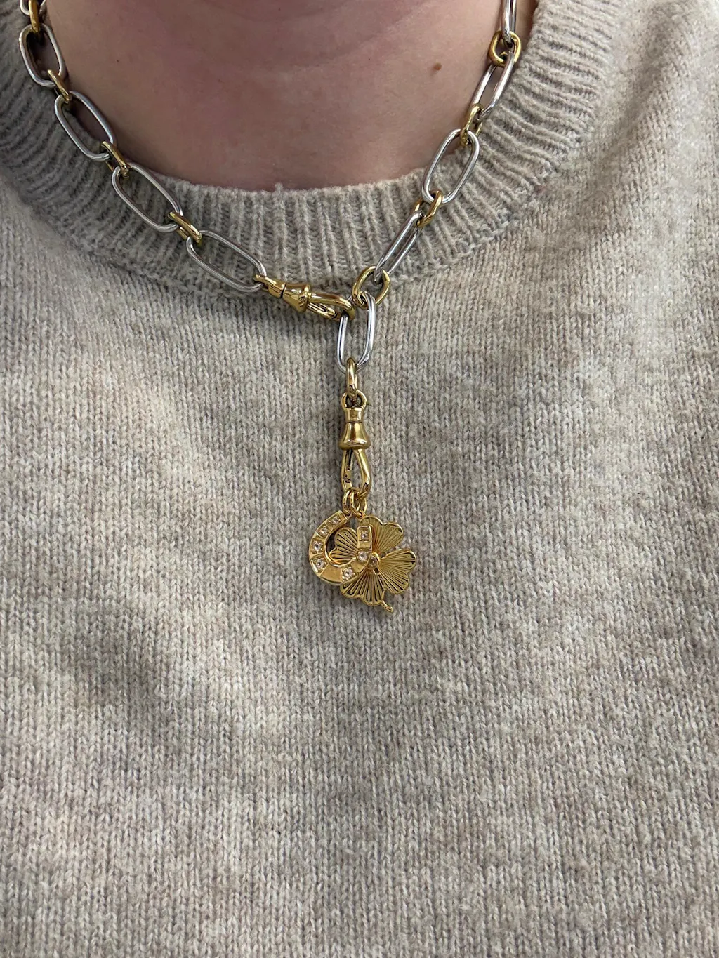 The Lauren two tone necklace is an oversized link chain with a bold, sculptural presence and a clean, modern sensibility. Featuring substantial gold links and a swivel clasp for easy wear, it is designed to feel strong yet effortless. Wear it as a classic statement necklace or adjust it into a Y shape to hold your favorite pendants and charms. Versatile and intentional, Lauren is a foundational piece that anchors your layers and evolves with your styling over time