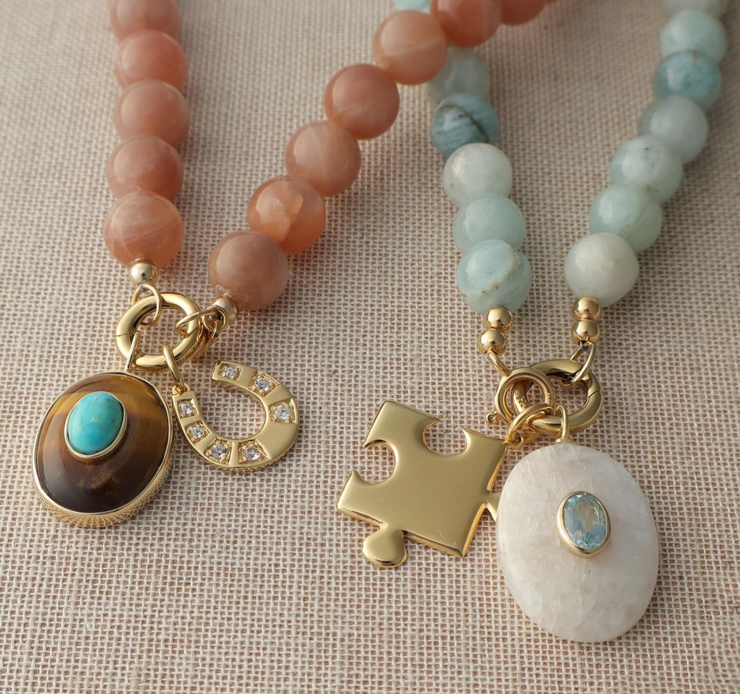 Our Sol pendant features rich tiger’s eye with a vibrant turquoise center.