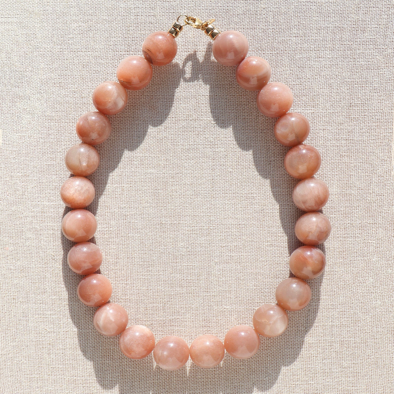 Radiant and full of warmth, our Sunstone Large Sphere Necklace features irregular beads arranged in a natural spectrum of soft peach, warm apricot, and sunlit copper tones. Each sphere carries subtle flashes that catch the light, creating a gentle, luminous glow.