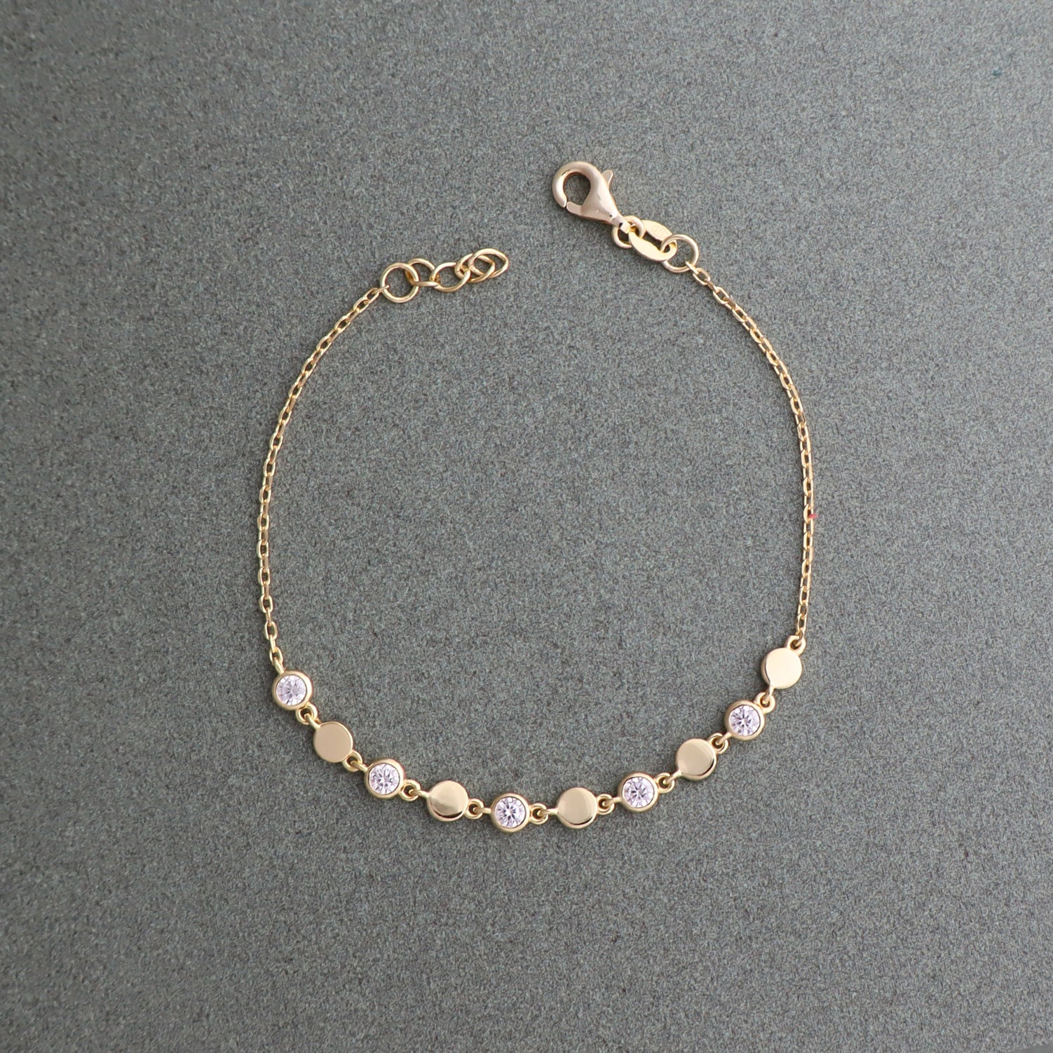 The Millie Bracelet is a modern take on an everyday classic. Featuring round stations that alternate between smooth metal discs and bezel set cubic zirconia, it offers a subtle play of shine and sparkle.