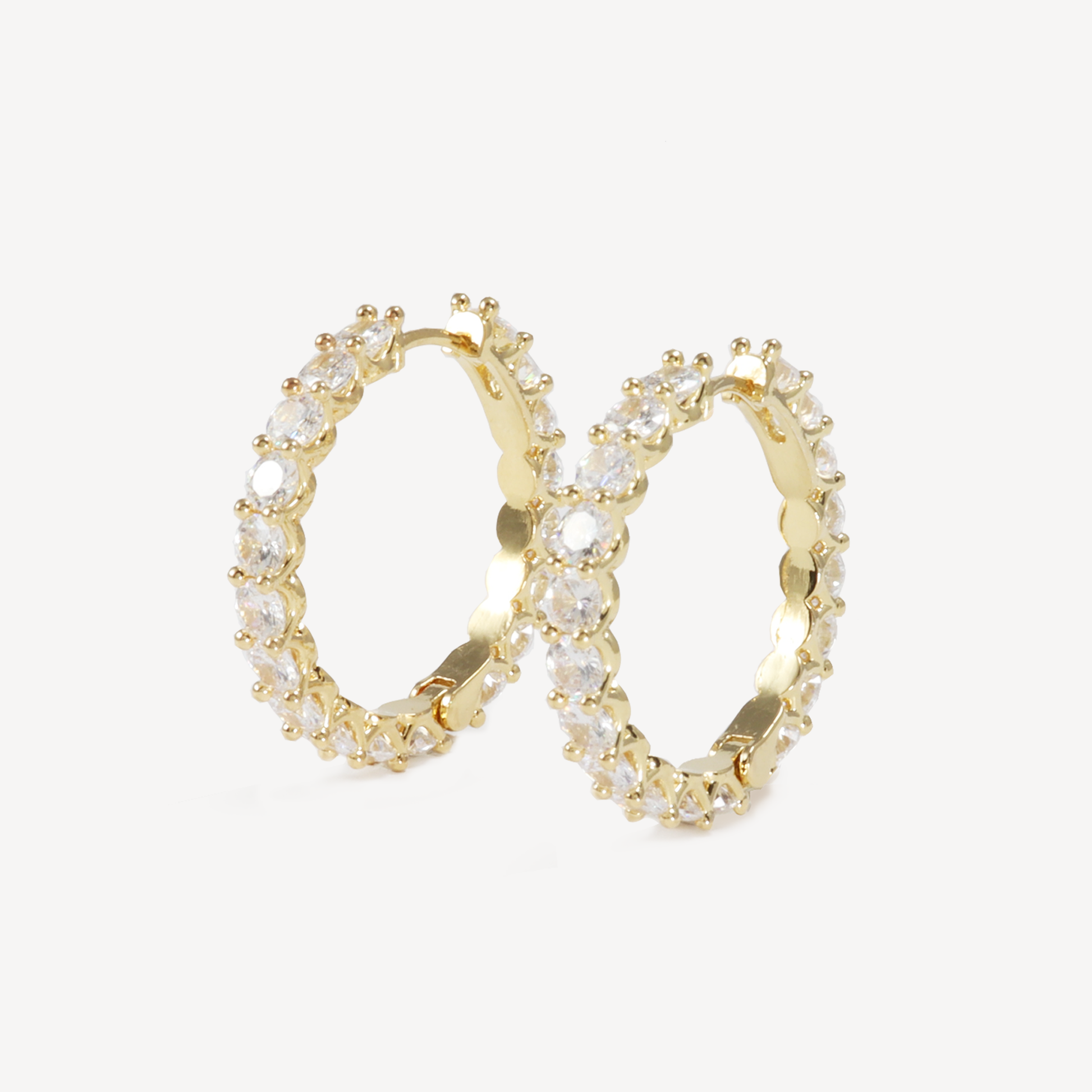 Bold, bright, and made to shine. The Brielle Hoops feature a full row of CZ pavé that captures the look of real diamonds — radiant from every angle. Perfect for holiday dressing or any moment that calls for a little extra sparkle.